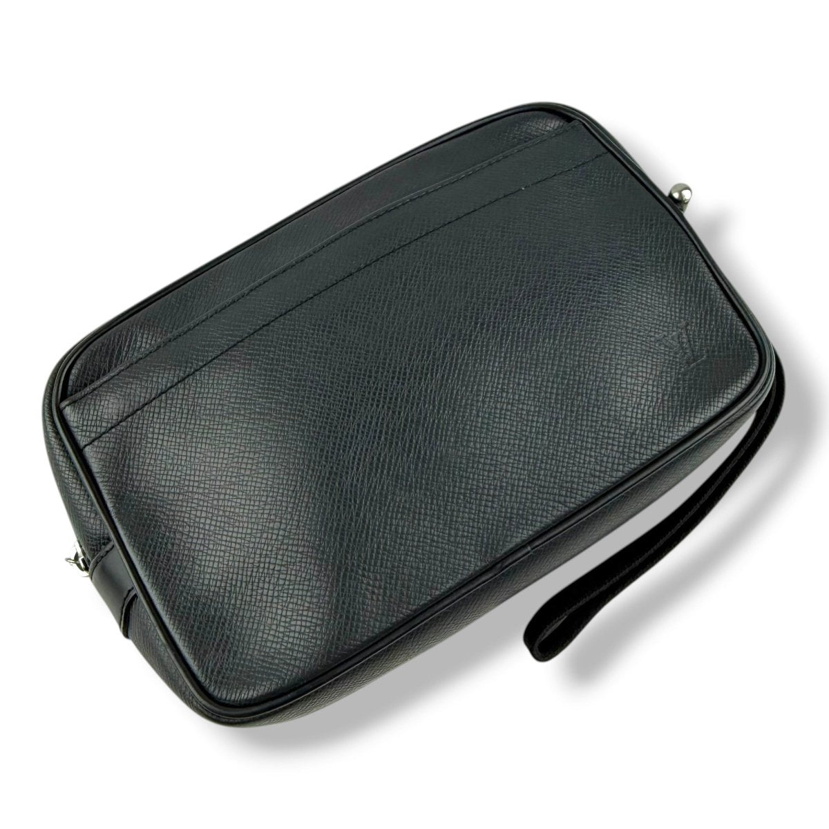 The Louis Vuitton Kalga clutch from the Taiga line is a sleek, structured accessory crafted from durable, grained Taiga leather, known for its refined matte texture and understated luxury. Designed with a zip-top closure and a compact rectangular silhouette, it often includes a wrist strap for easy carrying and a practical interior suitable for essentials like a phone, cards, and documents.