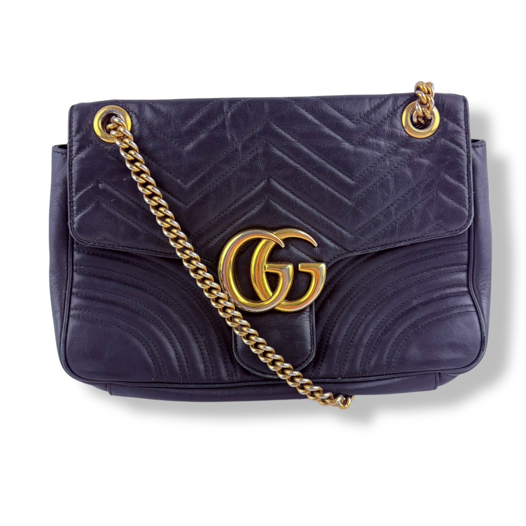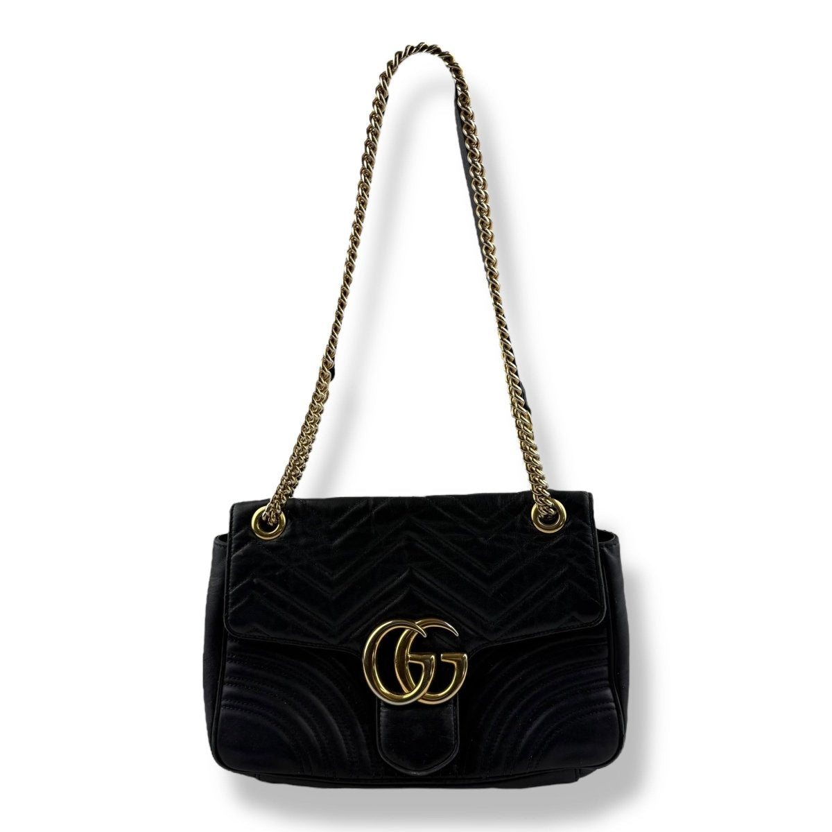 The Gucci GG Marmont Bag is a statement piece that epitomises luxury and sophistication. This iconic bag features the instantly recognisable double G hardware in antique gold-tone finish, symbolising timeless elegance. The Marmont's sleek design is complemented by its versatile chain strap, which can be worn over the shoulder or doubled for a shorter, more structured carry.